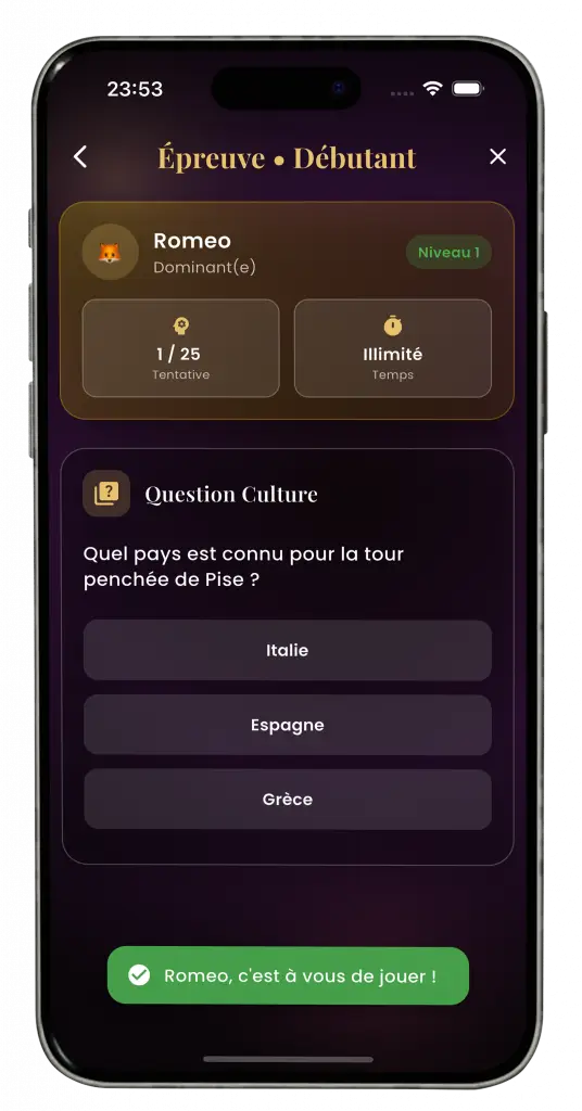 Les premiers frissons. Démarrez en douceur avec des épreuves ludiques : quiz, trivia et défis romantiques. Parfait pour briser la glace et créer la complicité.