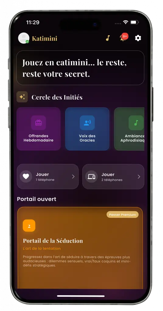 Katimini est une application immersive conçue pour les couples, combinant jeu, apprentissage et sensualité. Notre objectif est de renforcer la complicité, stimuler la créativité et créer des moments intimes mémorables.